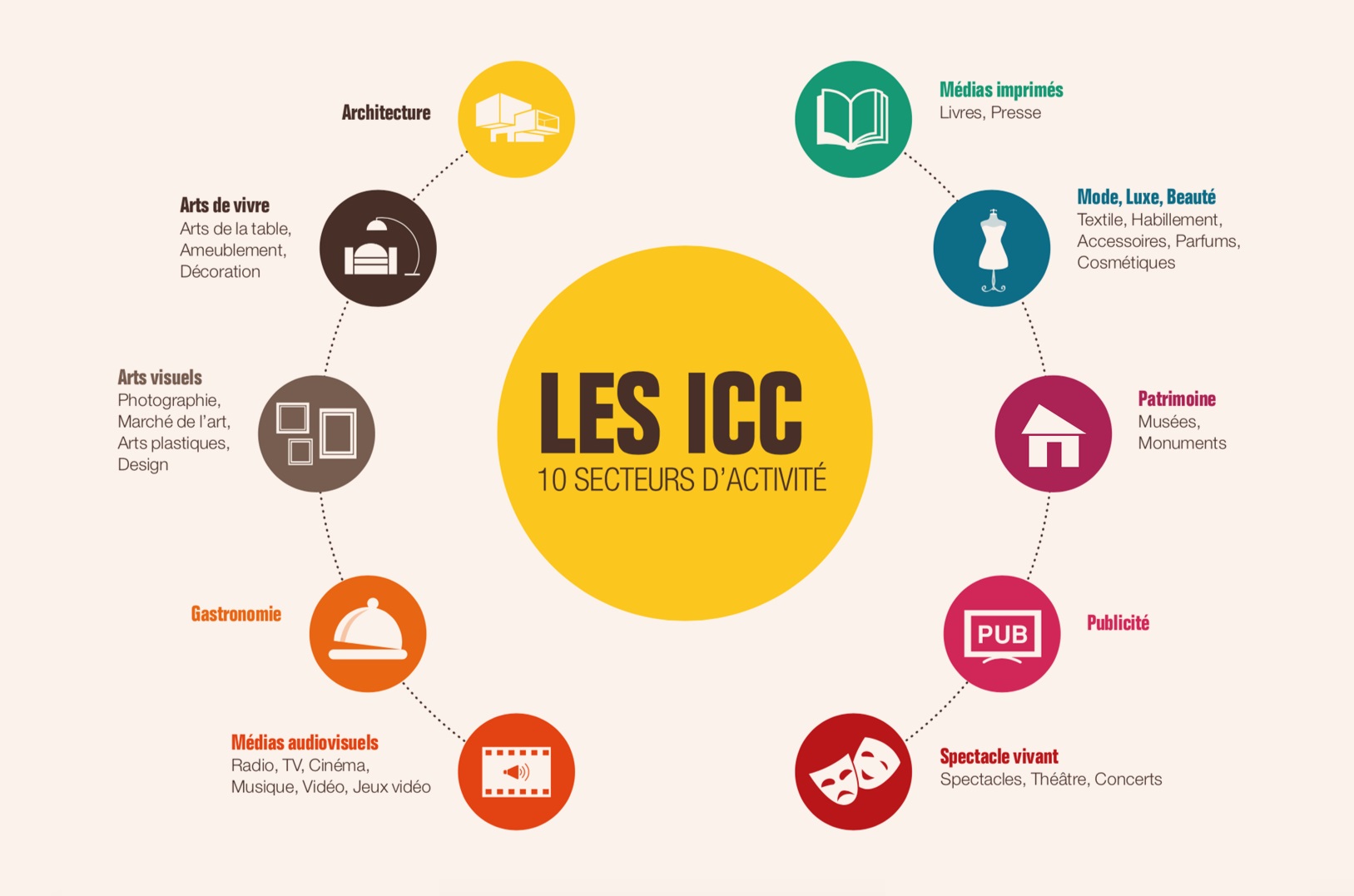 Les ICC englobent une variété de secteurs qui produisent et distribuent des biens et services culturels. Cela inclut traditionnellement la musique, le cinéma, la littérature, les arts visuels et le spectacle vivant, mais aussi des domaines plus modernes comme le design, l’architecture, la mode, la publicité, et même les nouvelles technologies utilisées pour la création et la distribution de contenu culturel.